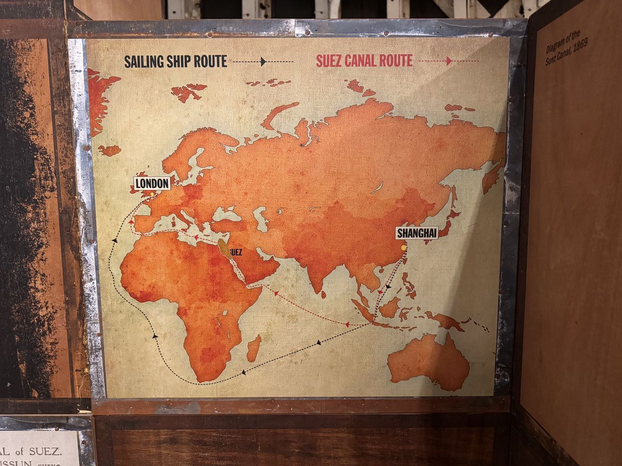 The Cutty Sark, built in 1869, was one of the last tea clipper ships, and took 8 trips to and from China around the southern tip of Africa. Supplanted by steamships through the Suez Canal, the Cutty Sark began sailing to Australia and back for the wool trade. Built for speed, it was one of the fastest clipper ships every built, and one of its trips from Sydney took a record 73 days. The Cutty Sark was eventually preserved as a museum ship and became a prominent attraction in Greenwich, London, after it was opened to the public in 1957.