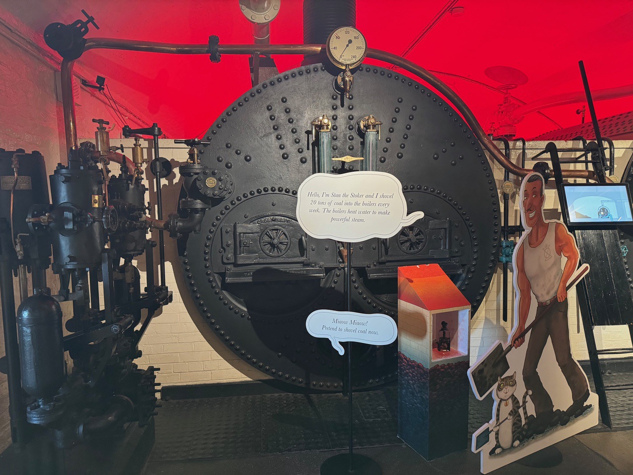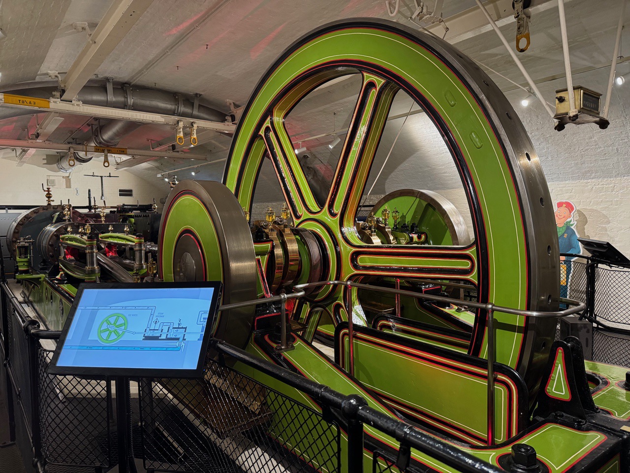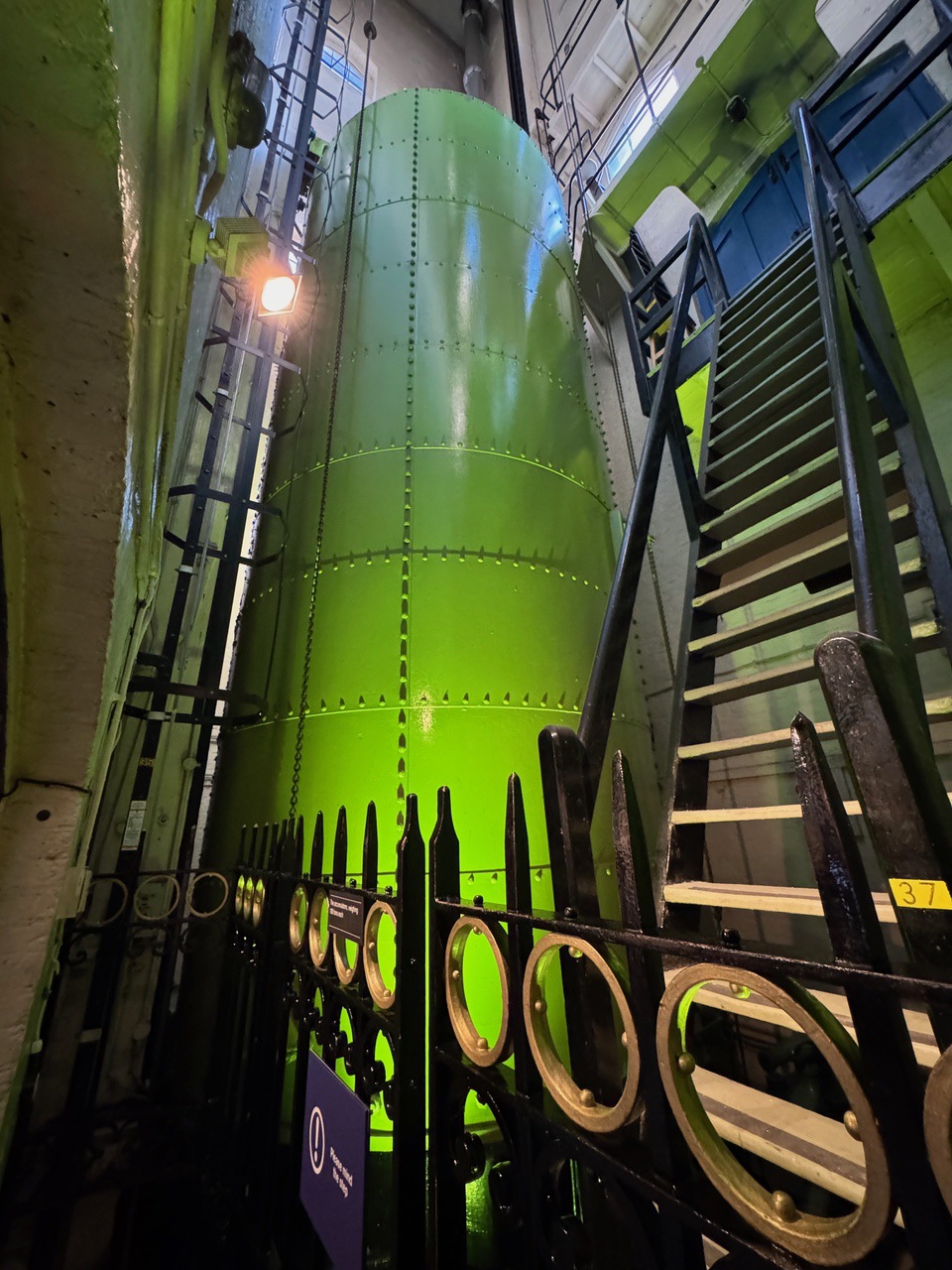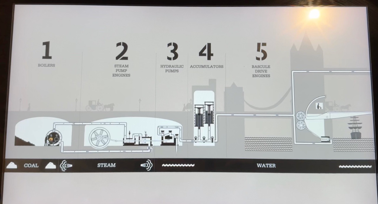 During the self-guided tour, there were video displays showing how the bridges were raised, section by section. Initially, the bridge was powered by steam engines. These engines used steam generated from large boilers to create hydraulic pressure. This pressure was stored in accumulators, which released water to operate the pistons that raised the bascules. The entire process allowed the bascules to lift in about one minute. In 1976, the bridge transitioned to an electro-hydraulic system, all on the floor below the engine room tour. This system uses electric pumps to create hydraulic energy, replacing the steam power. The current mechanism still relies on hydraulic principles, but it is more efficient and environmentally friendly.